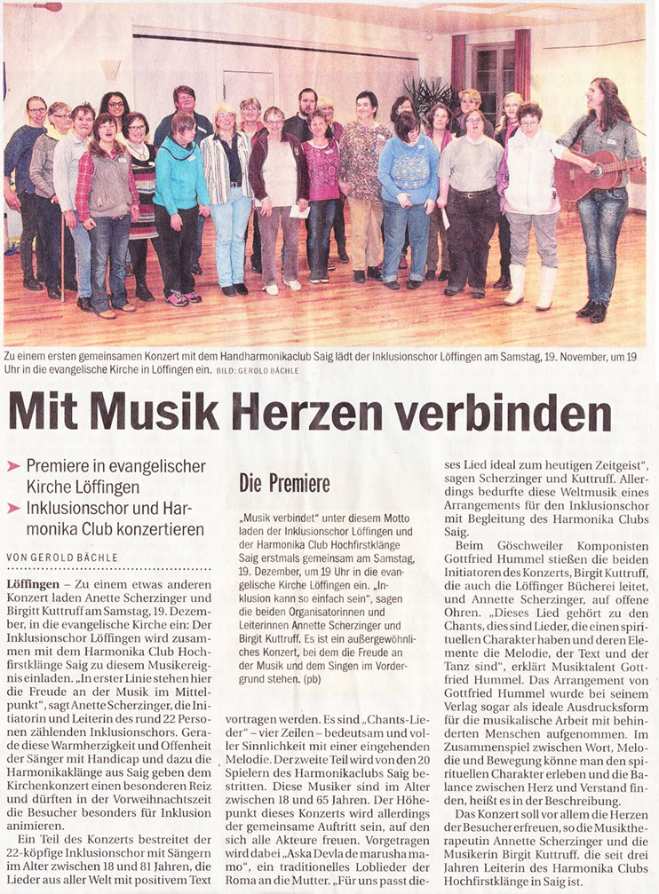 Inklusionschor und Harmonika Club als Akteure. 150 Zuhörer in der evangelischer Kirche Löffingen. (Bericht Südkurier Gerold Bächle 21.12.15)
