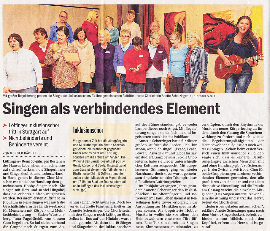 Am 6.9.2013 berichtete der Schwarzwäder Bote (Rainer Bombardi) „Musik trifft mitten ins Herz, Annette Scherzinger beschreitet als Musikthearapeutin neue Wege“ und wenig später schrieb die Badische Zeitung „Spaß haben beim Singen, Jeden ersten Mittwoch im Monat lädt Annette Scherzinger zu einem offenen Treffen ein“.